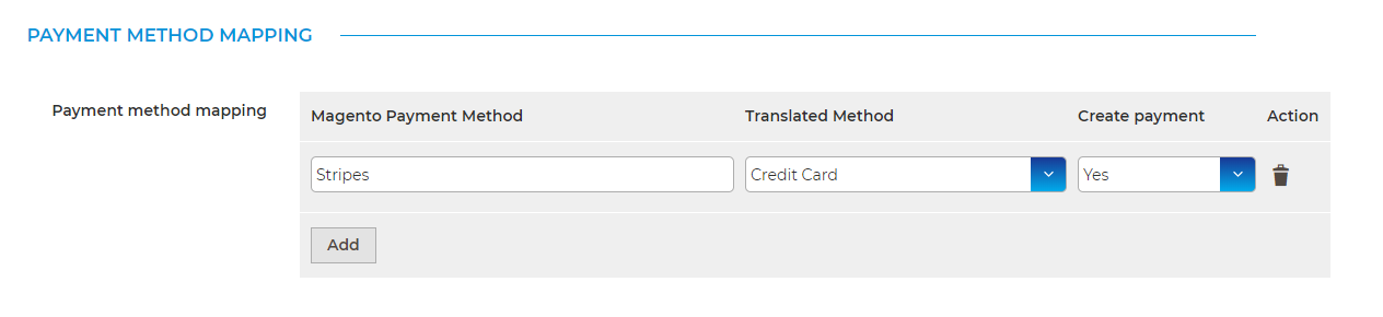 From here you can map Magento2 shipping method with Connect shipping methods.To add a new mapping, click on the "Add" button, fill the Magento2 shipping method and select the matching method in connect :Note : when connect tries to import a new order, if the mapping is missing for the shipping method, you'll get an error notification in the bell icon.You can also check errors from Integration into the 'Sync errors' tab by filtering 'order' on the 'Type' column.B. Payment method mapping