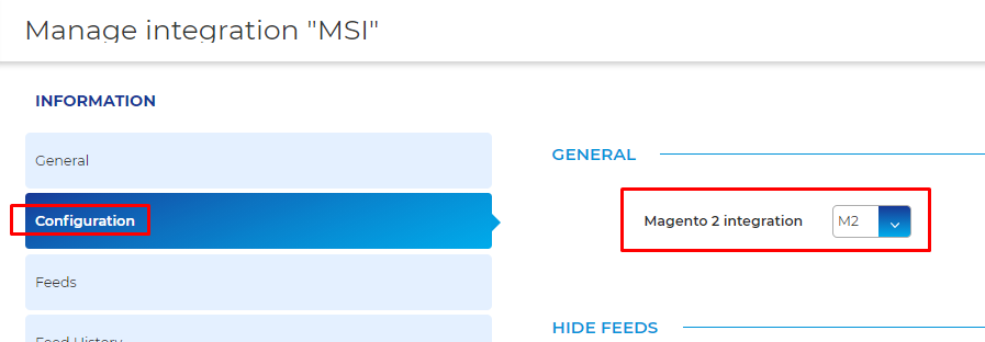 Once the integration is saved, you must link the MSI integration with your Magento2 integration : to do it, select tab "Configuration", select the M2 integration and save :