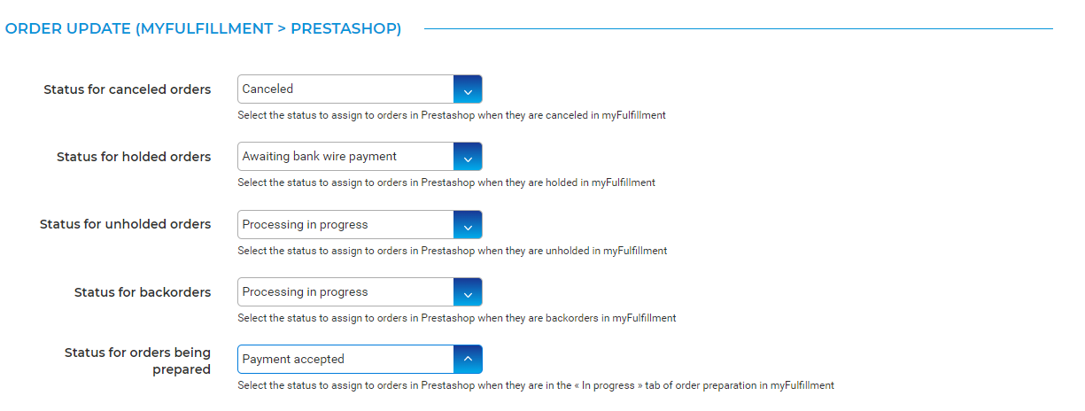 Here the order status to be updated in Preastashop for the status changes in myFulfillment can be specified.