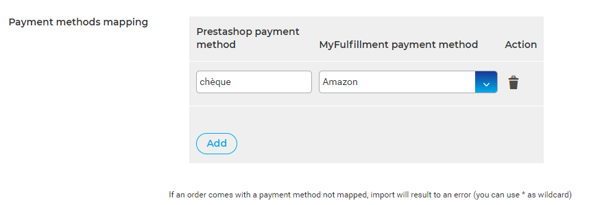 - Payment method mapping : You can fill here the matching for payment methods. The payment method in Prestashop should be entered below Prestashop payment method column and the corresponding myFulfillment payment method can be specified below the Myfulfillment payment method columns to be mapped.