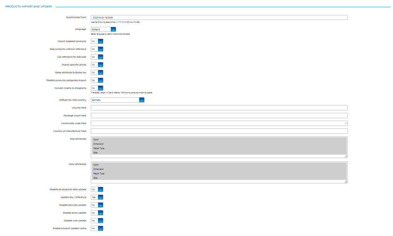 Here, the product import and update settings can be configured. The attributes of the product to be synced between myFulfillment and Prestashop can be enabled. If you are not sure about the functionality of the feature, please get in touch with the BMS support team before enabling the options.