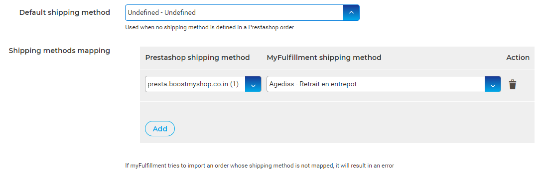 - Shipping method mapping : The shipping methods associated with the orders in prestashop can be mapped with the shipping methods in myFulfillment here. Under Prestashop shipping method provide the shipping method in Prestashop and below Myfulfillment shipping method choose the corresponding shipping method in myFulfillment.
