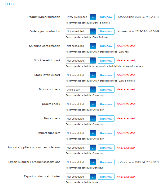 - Run the "Orders syncronization" feed manually ("Run now" button) if you have not too much orders to import, and schedule it every 5 minutes.