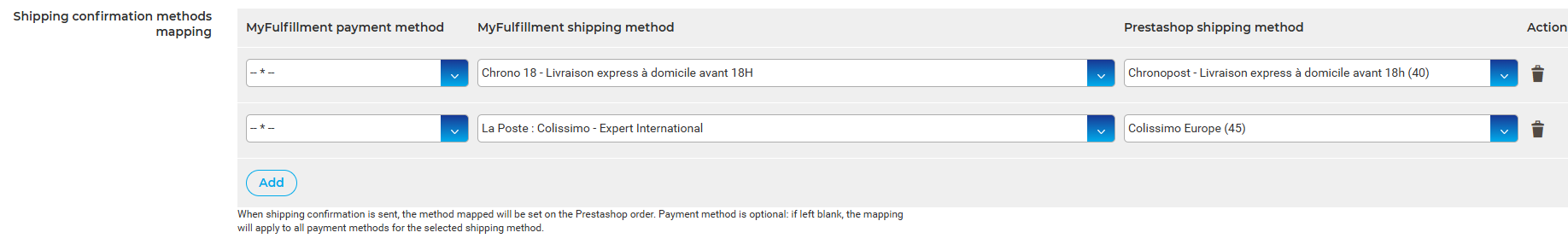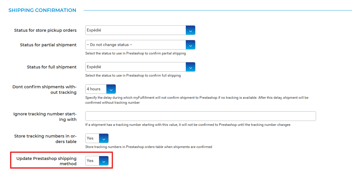 In the PrestaShop integration with myFulfillment, it is possible to update the carrier to PrestaShop. This setting has a on/off toggle and a mapping if at yes