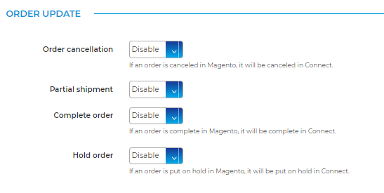 - Canceled = order will be canceled into Connect, product stock reserved will be decreased